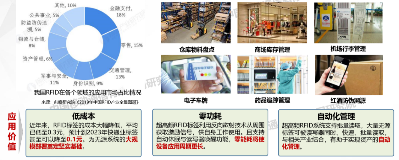 低成本方面,近年來,RFID標簽的成本大幅降低,平均已低至0.3元,預計到2023年快遞業標簽甚至可以降至0.1元,為無源系統的大規模部署奠定堅實基礎;零功耗方面,超高頻RFID標簽利用反向散射技術從周圍獲取激勵信號,供自身工作使用,且支持自動休眠與讀寫器喚醒功能,零能耗將使設備應用周期更長;自動化管理方面,超高頻RFID系統支持批量讀取,大量無源標簽可被讀寫器同時、快速、批量讀取,與相關產業結合,有助于實現資產的自動化管理。