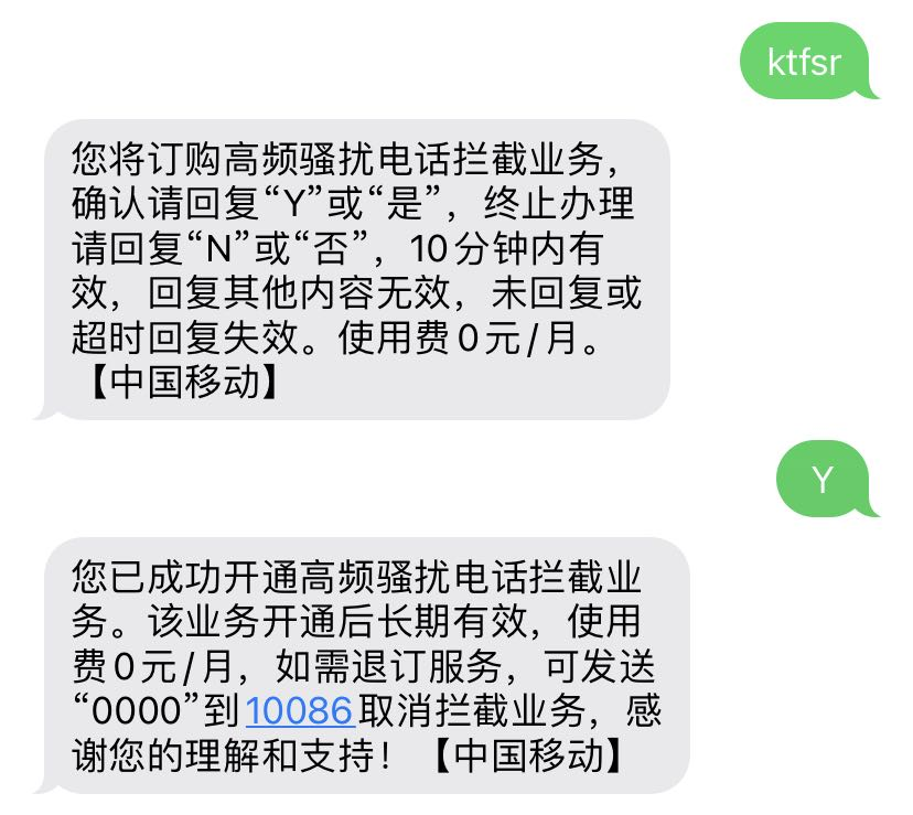 發送“開通防騷擾”首字母“KTFSR”到10086即可免費開通高頻防騷擾電話攔截業務